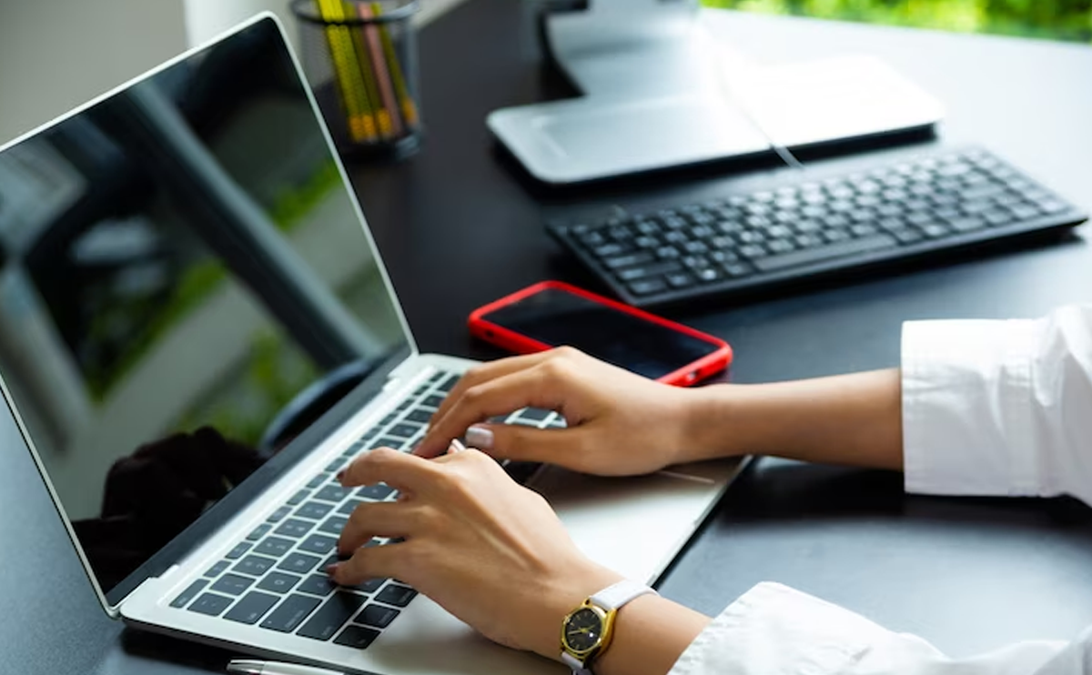 female hand typing on keyboard of laptop